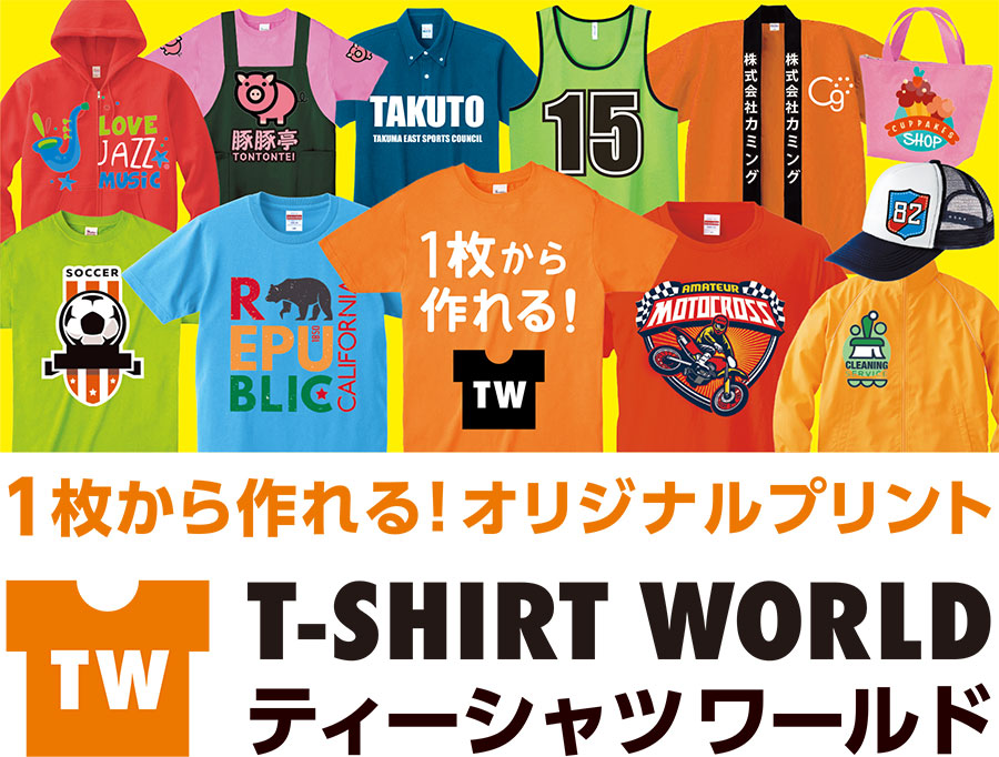 T シャツ、ポロシャツ、ブルゾンなどのオリジナルウェアが作れる熊本市東区桜木のティーシャツワールド。イベントで、部活やサークルで、飲食店や企業などお揃いのユニフォームが作れます。