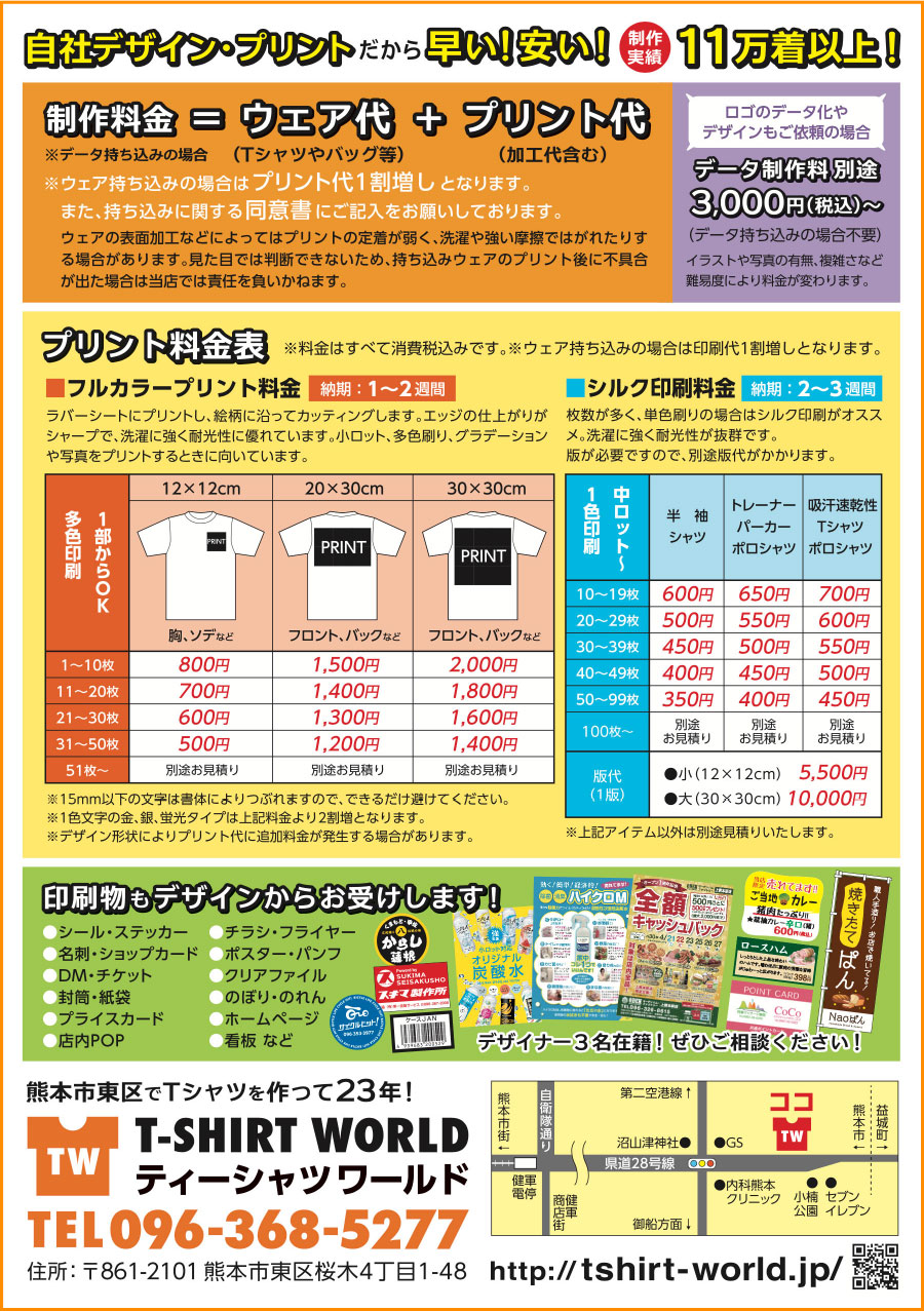 オリジナルプリントTシャツが1枚から作れる!熊本市東区桜木「ティーシャツワールド」。ポロシャツやブルゾン、法被なども!