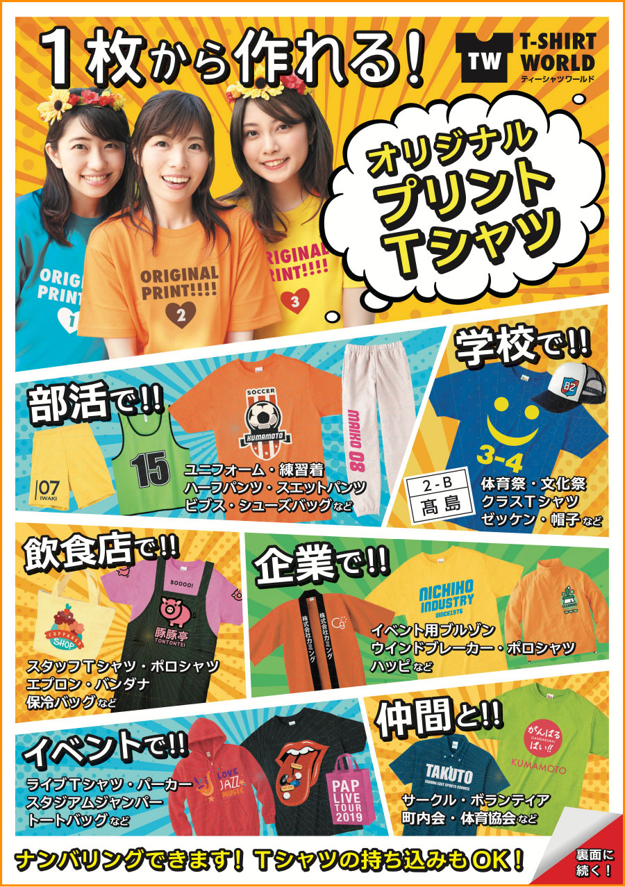 T シャツ、ポロシャツ、ブルゾンなどのオリジナルウェアが作れる熊本市東区桜木のティーシャツワールド。イベントで、部活やサークルで、飲食店や企業などお揃いのユニフォームが作れます。
