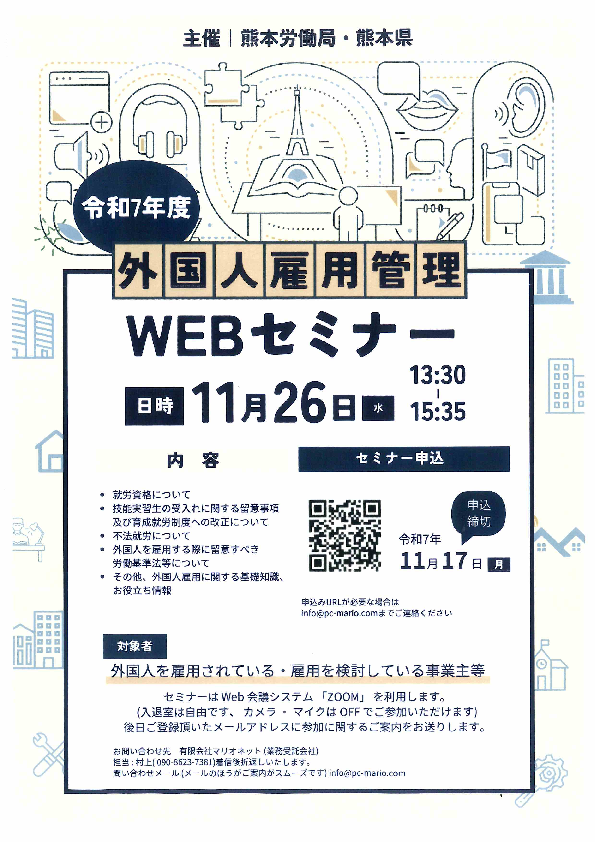 【セミナー】外国人雇用管理WEBセミナー開催のご案内(11/17申込締切)