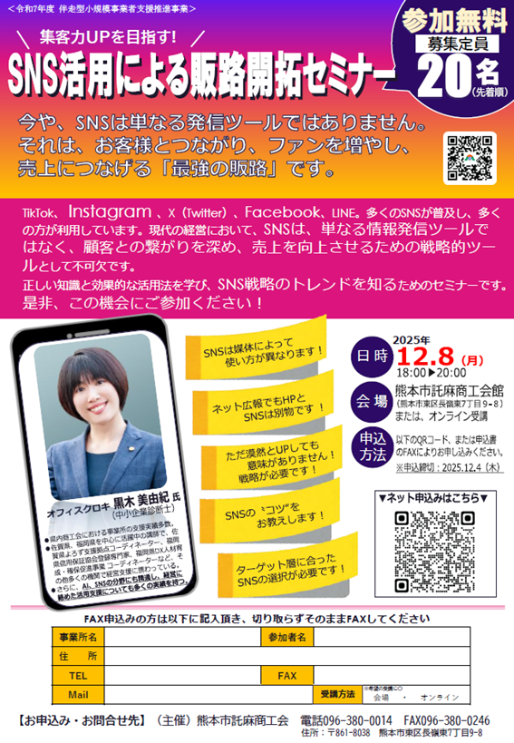 大好評につき、今年も「SNS活用による販路開拓セミナー」を開催します。 SNSでのPR広報をされている方も多いかと思います。 しかし、思うように効果に結びつかない というお悩みを抱えていませんか? 今回のセミナーでは、SNSの正しい活用法、効果的な運用についてのスキルアップを目指します。 是非、この機会にセミナーにご参加ください。 ■日時 :令和7年12月8日(月)18:00~20:00 ■会場 :熊本市託麻商工会 2階会議室 または、オンライン受講 ■定員 :先着20名 ■申込み:オンライン申込み、またはチラシ申込書のFAX 【オンライン申込みはこちら】⇒https://forms.gle/pBLzvmySqWf5eHWB9 【FAXお申込みはこちら】⇒チラシ申込書