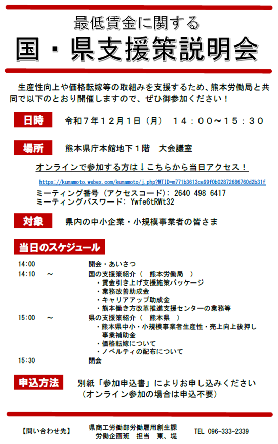 <内容> ◆日時:令和7年12月1日(月) 14:00~15:30 ◆場所:熊本県庁本館地下1階 大会議室 ◆スケジュール:チラシをご覧ください。⇒【こちら】 ◆申込方法:別紙「参加申込書」によりお申し込みください。 (オンライン参加の場合は申込不要) ◆オンラインで参加する方は↓こちらから当日アクセス! https://kumamoto.webex.com/kumamoto/j.php?MTID=m771b3613ce99f0b02872686760d2b31f ミーティング番号 (アクセスコード): 2640 498 6417 ミーティングパスワード: Ywfe6tRWt32 ◆対象:県内の中小企業・小規模事業者の皆さま