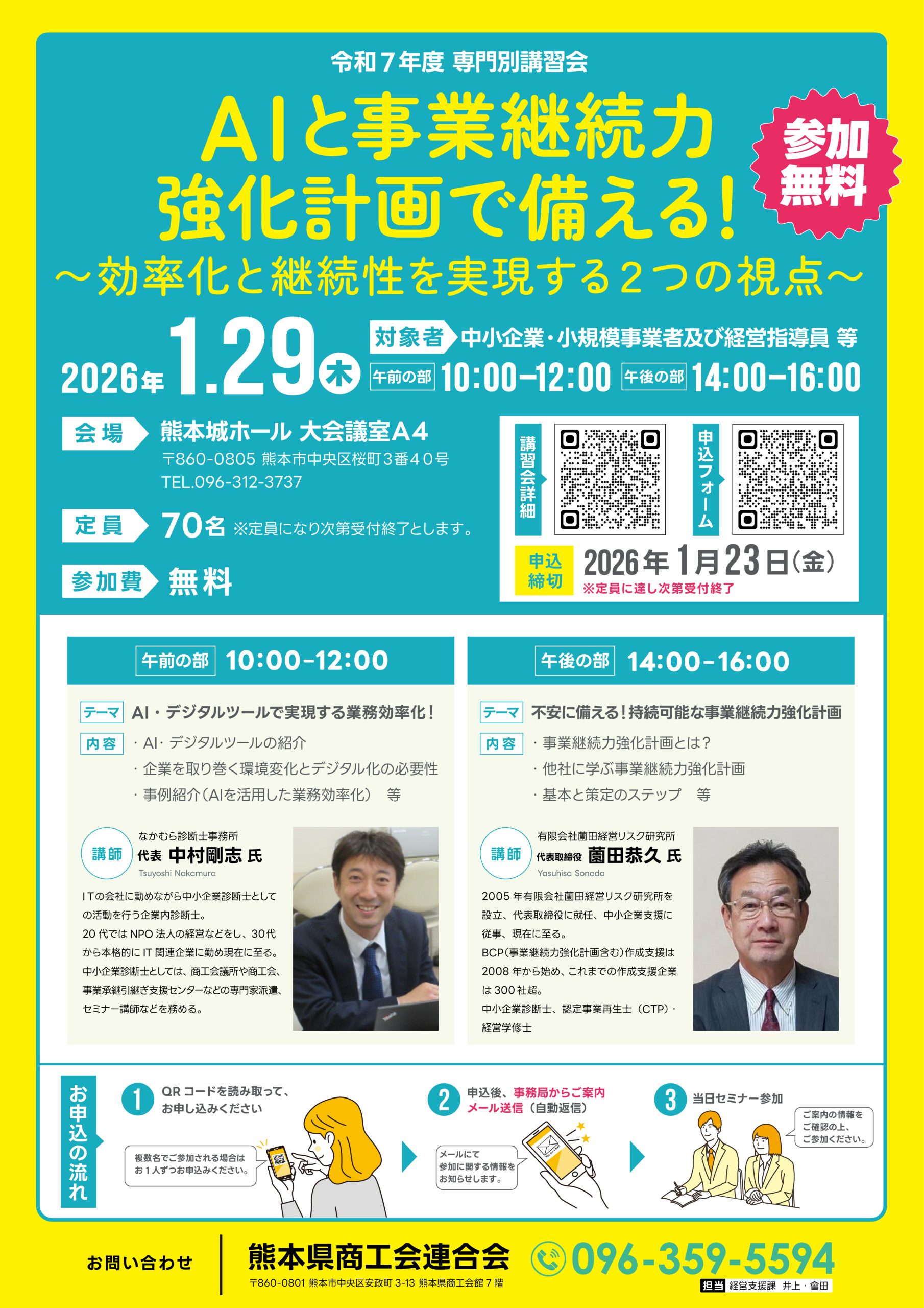 本講習会は、こうした社会背景を踏まえ、AI技術をはじめとするデジタルツールの実践的な活用方法と災害や危機に強い組織づくりを学ぶことで、持続可能な経営と危機対応能力を高め、実践的なスキルと考え方を提供することを目的としています。