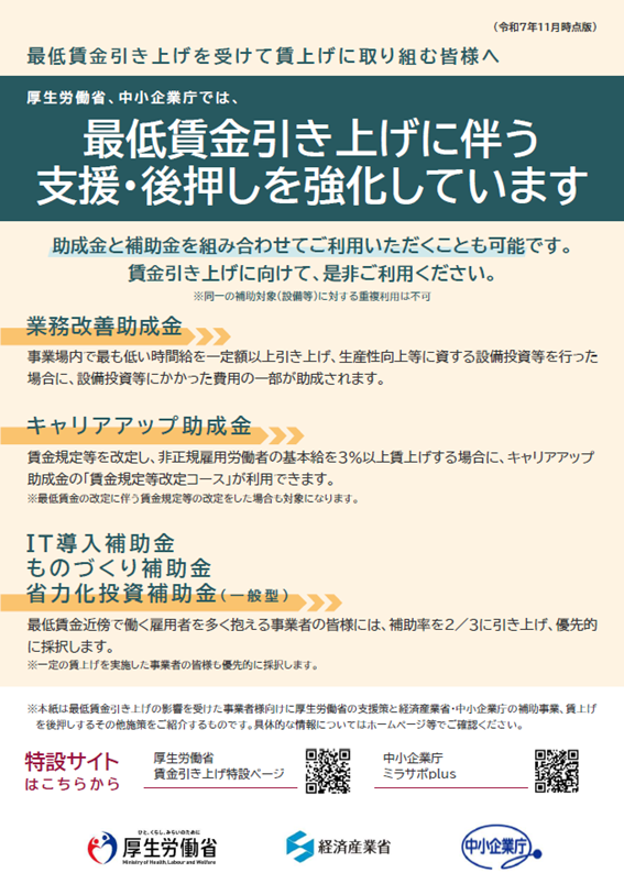 【補助金】最低賃金の引き上げに関する補助金等のご案内 2025.12.16 令和7年度の最低賃金が過去にない高水準の引き上げ額(全国加重平均66円)となったことを受けて、政府においては「中小企業・小規模事業者の賃金向上推進5か年計画」の実現に向けた各種施策の展開を進めており、特に最低賃金の引上げの影響を受けやすい小規模事業者への施策をご提案します。 ※詳細は【こちら】