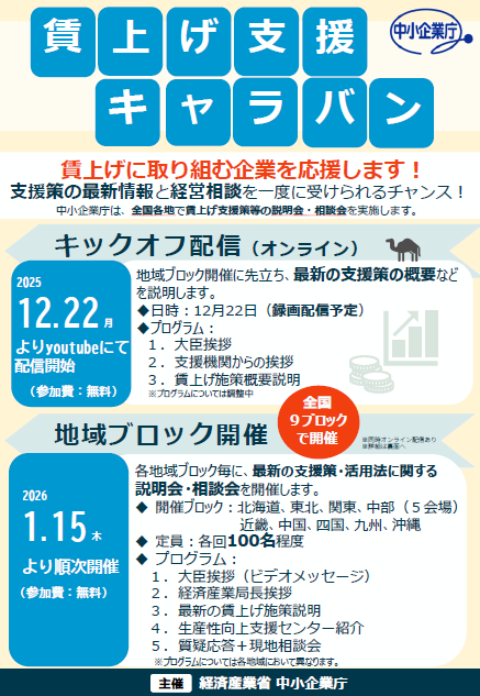 【九州ブロック】 □日時:2026年1月30日(金) 14:00~16:00 □開場:福岡県中小企業振興センタービル2階202会議室 (オンライン参加可) 参加を希望される方は、各自以下のURLからお申込みをお願いします。 賃上げ支援キャラバン申込ページ https://www.chusho.meti.go.jp/chingin/2025/251215.html ※チラシは【こちら】
