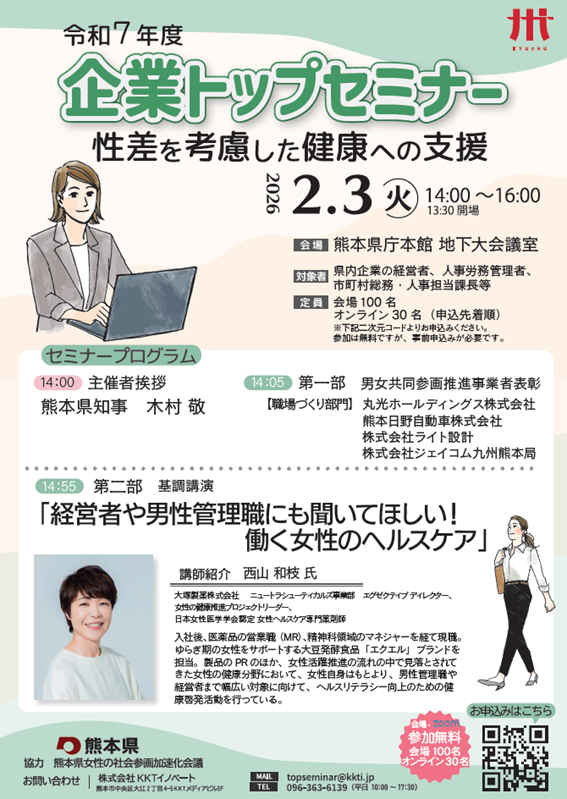 【セミナー】令和7年度企業トップセミナーの参加者募集について(2/3開催) 2026.01.15 熊本県では、男女が働きやすい環境整備や企業の意思決定の場への女性の参画促進等の重要性を考える契機とするためのセミナーを開催します。 1 日 時:和8年(2026年)2月3日(火)14:00~16:00 2 場 所:熊本県庁本館 地下大会議室(熊本市中央区水前寺6丁目18-1) 3 参加料:無料 ※事前申し込みが必要です。 ⇒詳細は【こちら】をご覧ください。