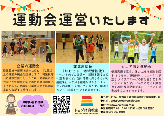 当社は上益城郡益城町にある、40 年以上の実績のある体育教室です。 トヨダ体育教室(益城町)では、体育指導で培った専門性を活かし、 これまで 企業・地域団体・シニアの皆さま向けの「運動会運営」 を 行ってまいりました🤸✨ 長年、子どもたちや地域の方々と関わる中で、 「体を動かす場は、人を笑顔にし、つながりを生む」 ということを強く実感しています😊🌈 その思いを地域にも広げたいと考え、 企業イベント🏢💼、地域交流会🏘🤝、シニア健康づくり👵👴🌿 など、 目的に合わせた“誰もが楽しめる運動会”を企画・運営してきました。 企業向けにはチーム力向上・健康増進💪 地域向けには参加しやすい交流の場づくり🎪 シニア向けには無理なく体を動かせるプログラム🌿 といった形で、年代や目的に合わせて内容をカスタマイズしています。 運動を通して人がつながり、地域が元気になる取り組み みなさまの場でも、こうした運動会を開催してみませんか? ◆『動けば、変わる。— 子どもの未来を応援する“無料”運動あそび教室 — 』 に関する記事は⇒【こちら】 ◆『児童発達支援事業所 “HEW+”(ヒュープラス) 』開所しました!! 』 に関する記事は⇒【こちら】 (会社情報) ・熊本県上益城郡益城町大字古閑42-12 ・TEL:096-360-0202 ・mail:tydspowell@gmail.com ・HP:https://toyodataiiku.com/ ・営業時間:9:00〜18:00 ※日曜・祝日は定休日