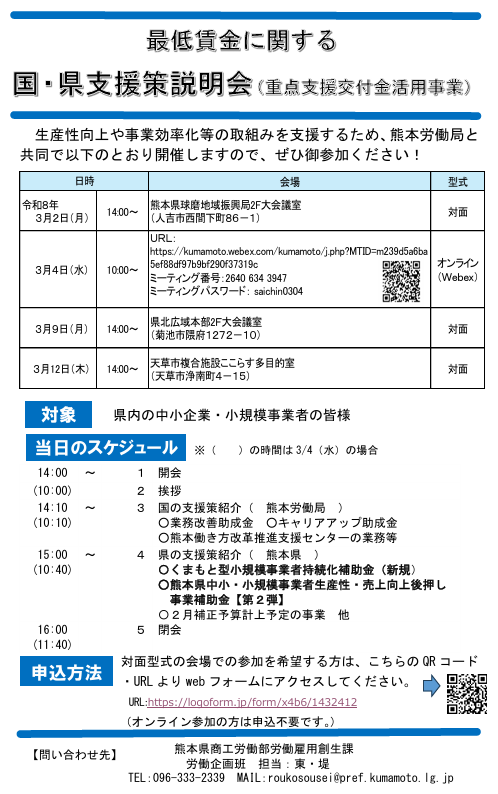 <開催概要> ◆日時:令和8年3月2日(月) 14:00~16:00 場所:球磨地域振興局2階大会議室 形式:対面 ◆日時:令和8年3月4日(水)10:00~11:40 形式:オンライン ◆日時:令和8年3月9日(月)14:00~16:00 場所:県北広域本部2階会議室 形式:対面 ◆日時:令和8年3月12日(木)14:00~16:00 場所:天草市複合施設ここらす多目的室 形式:対面 ◆申込方法:対面については、別添チラシに記載のWEBフォームからの事前申込が必要です。 ※オンライン参加については事前申込不要です。 ※チラシは【コチラ】