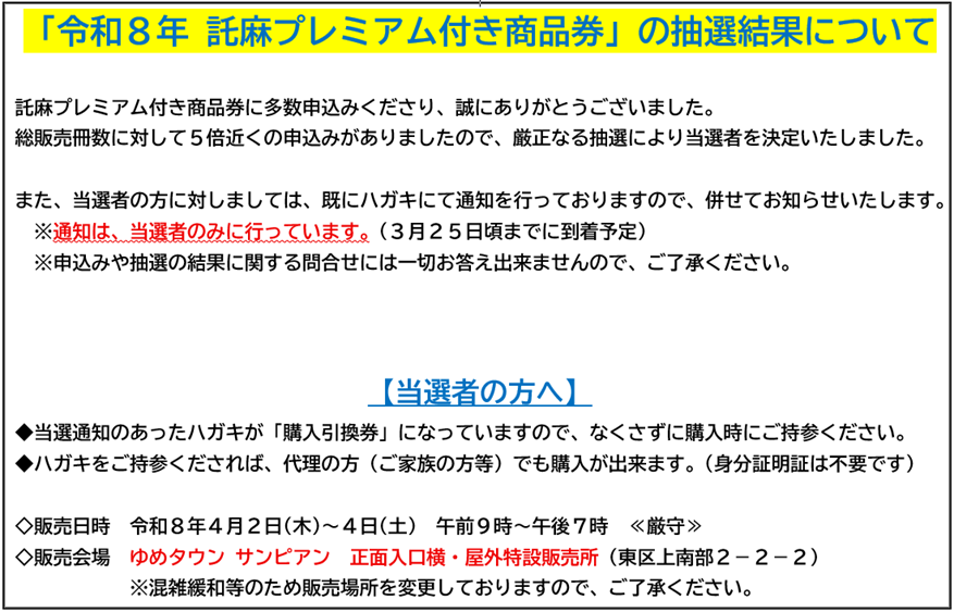 【お知らせ】「令和8年 託麻プレミアム付き商品券」の抽選結果について