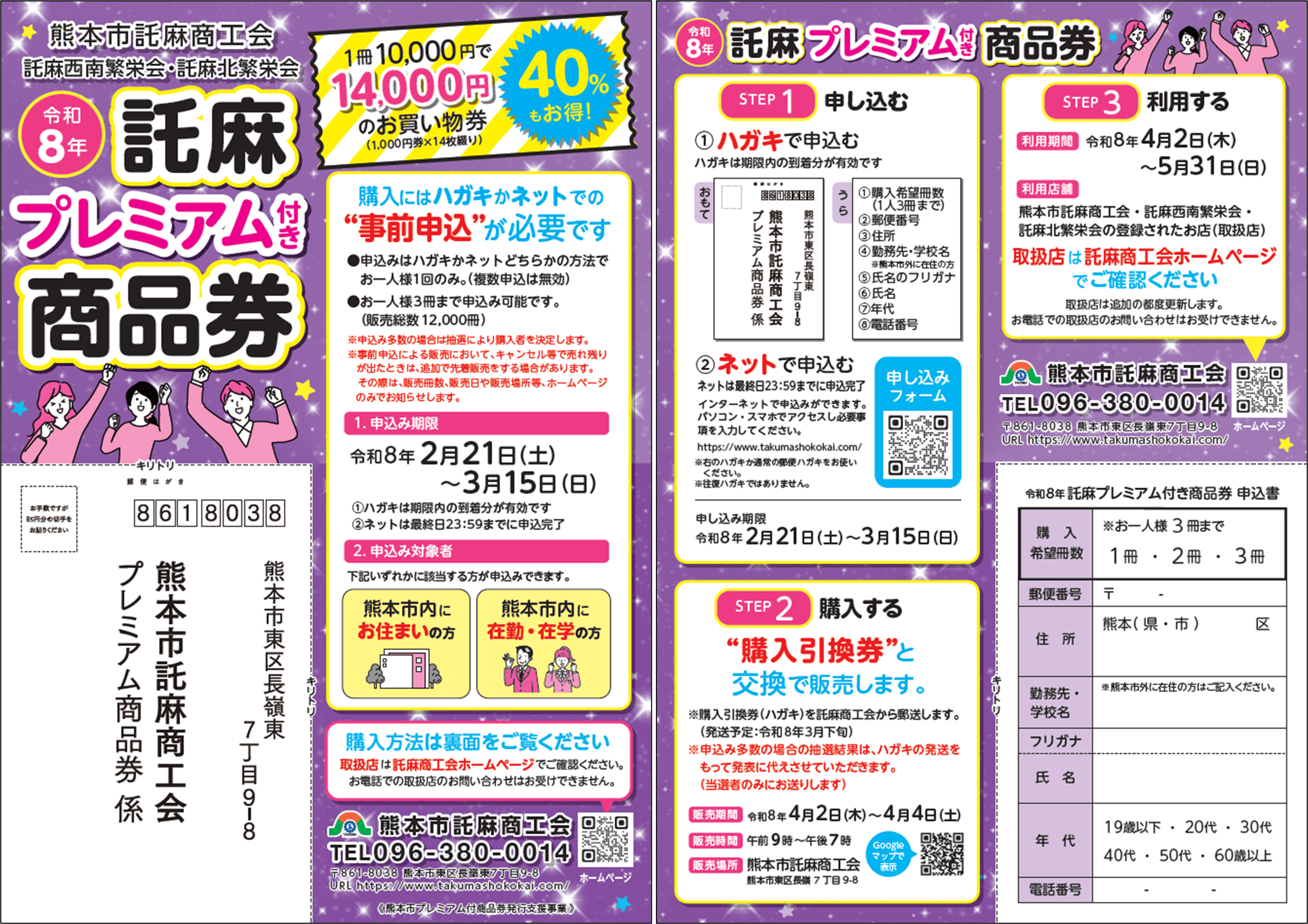 「令和8年託麻プレミアム付き商品券」の購入申し込みの受付を、令和8年2月21日(土)より開始 いたします。 ご購入希望の方は、事前にお申込みが必要となりますので、お申込みフォームから「ネット申し込み」、 または「ハガキ申し込み」によりお申込み下さい。 ★取扱店の更新情報などにつきましては、随時、特設ページ(ホームページ右側のアイコンを押して ください)内にてお伝えします。(特設ページへジャンプ) <購入申込みについて> ◆購入申込み上限冊数:お一人様3冊まで、1回のみの申込み(複数申込みは無効とさせていただきます。) ◆申込方法:ネット申込み、またはハガキ申込み ◆申込み期限:令和8年2月21日(土)~3月15日(日) ◆申込み対象者:①熊本市内にお住まいの方 ②熊本市内に在勤・在学の方 ※申込み多数の場合は抽選により購入者を決定いたします。 申込み締切後、改めて購入者決定後のスケジュール等をホームページにて掲載いたします。⇑ その他詳細はコチラをクリック ⇑ ※チラシ(表)PDF ※チラシ(裏)PDF <ネット申込みの方>
